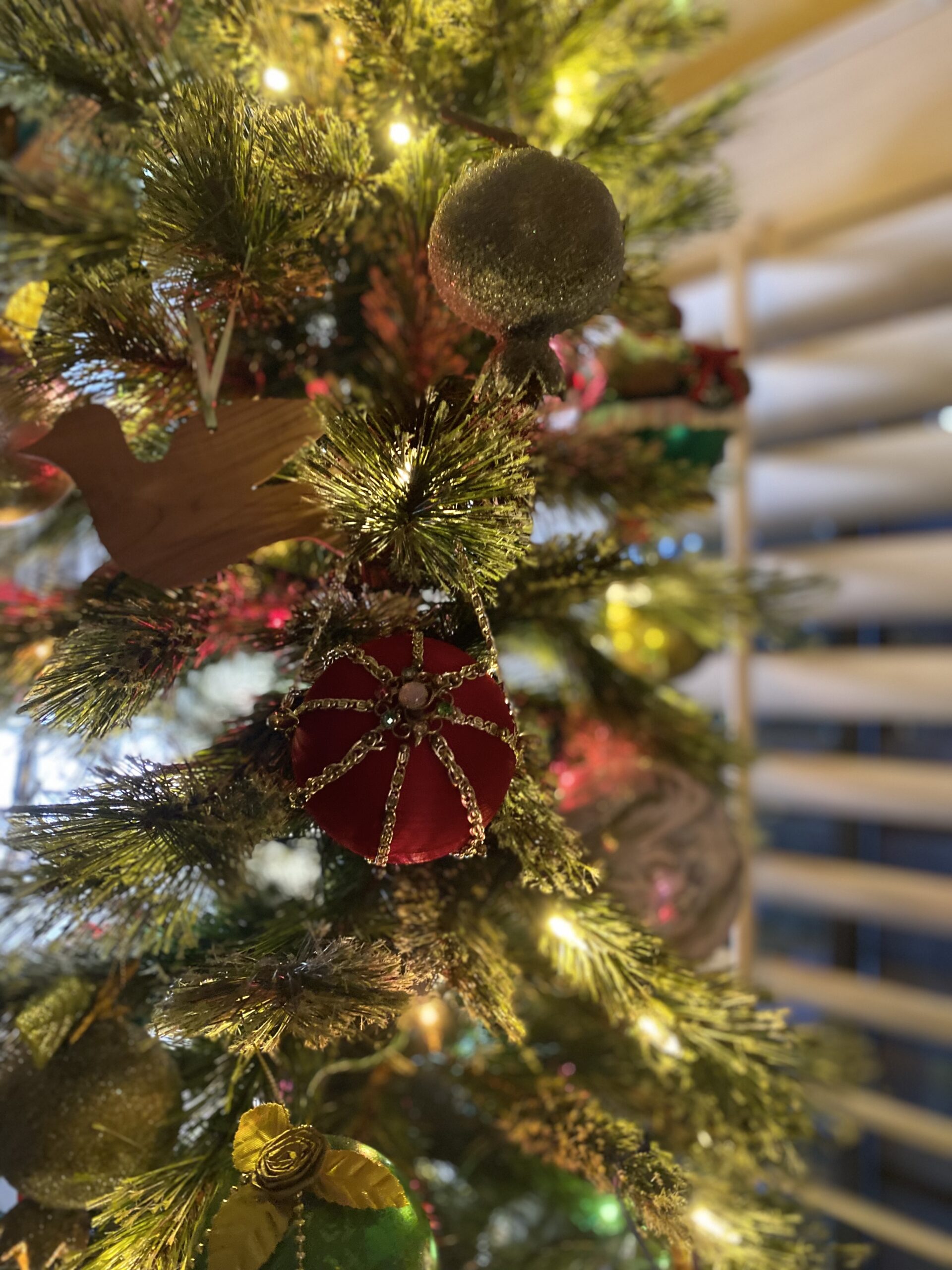 The house was quiet as my husband lay sleeping, and in the background, softly, was moody instrumental Christmas music. It was the dawn of the day before Thanksgiving, and I determined to have my tree dressed before the weekend festivities began. The bin of ornaments opened on the dining room table gave me easy access, and one by one, I unwrapped the tissue-wrapped treasures, strategically placing them on the wire limbs.